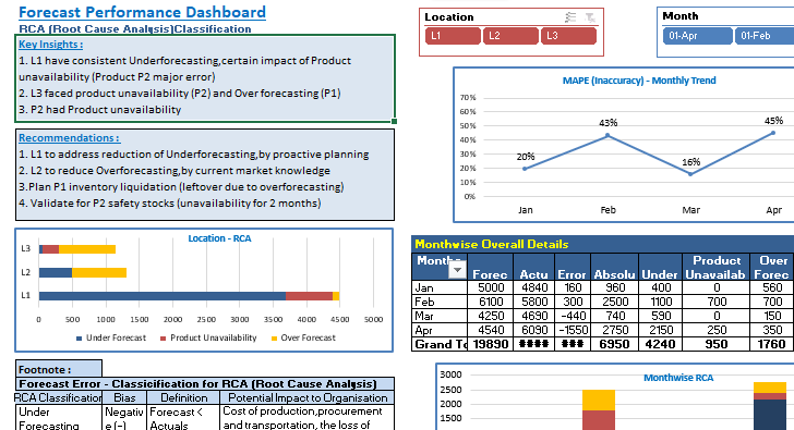 The model contains an interactive dashboard which, at the end of the month, can be used to share forecast error in demand planning/S&OP meetings sessions as a standard report. The dashboard present the data via effective visualizations that depict the narrative behind key performance indicators, including key insights and recommendations on a single screen.