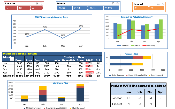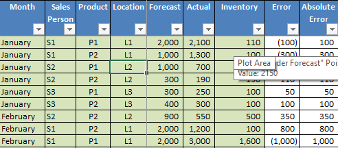 The most important elements are Forecast, Actual Sales, and Inventory (closing) for the given forecasting period (month, week, etc.). For simplicity, we are using 2 products (P1, P2) and 3 locations (L1, L2 and L3). The forecasting horizon is monthly, from January to April. Other details like Sales Representative, Product segment, and Categories can be added as per your business requirements. The purpose is to monitor forecasting performance by product and location on a monthly basis.