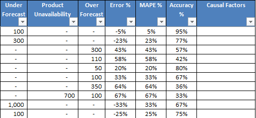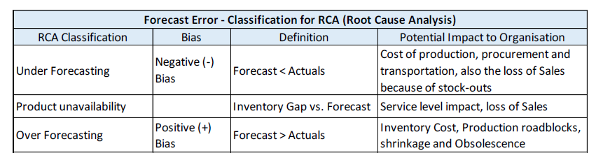 Forecast error simply defined is the difference between the actual demand (sales) and forecasted demand. Forecast Error = (Forecast – Actual) / Actual. Root Cause Analysis (RCA) can be split into 3 classifications: Over Forecasting, Product Unavailability and Under forecasting. The following table (Table 1) gives an insight into these 3 RCA classifications.