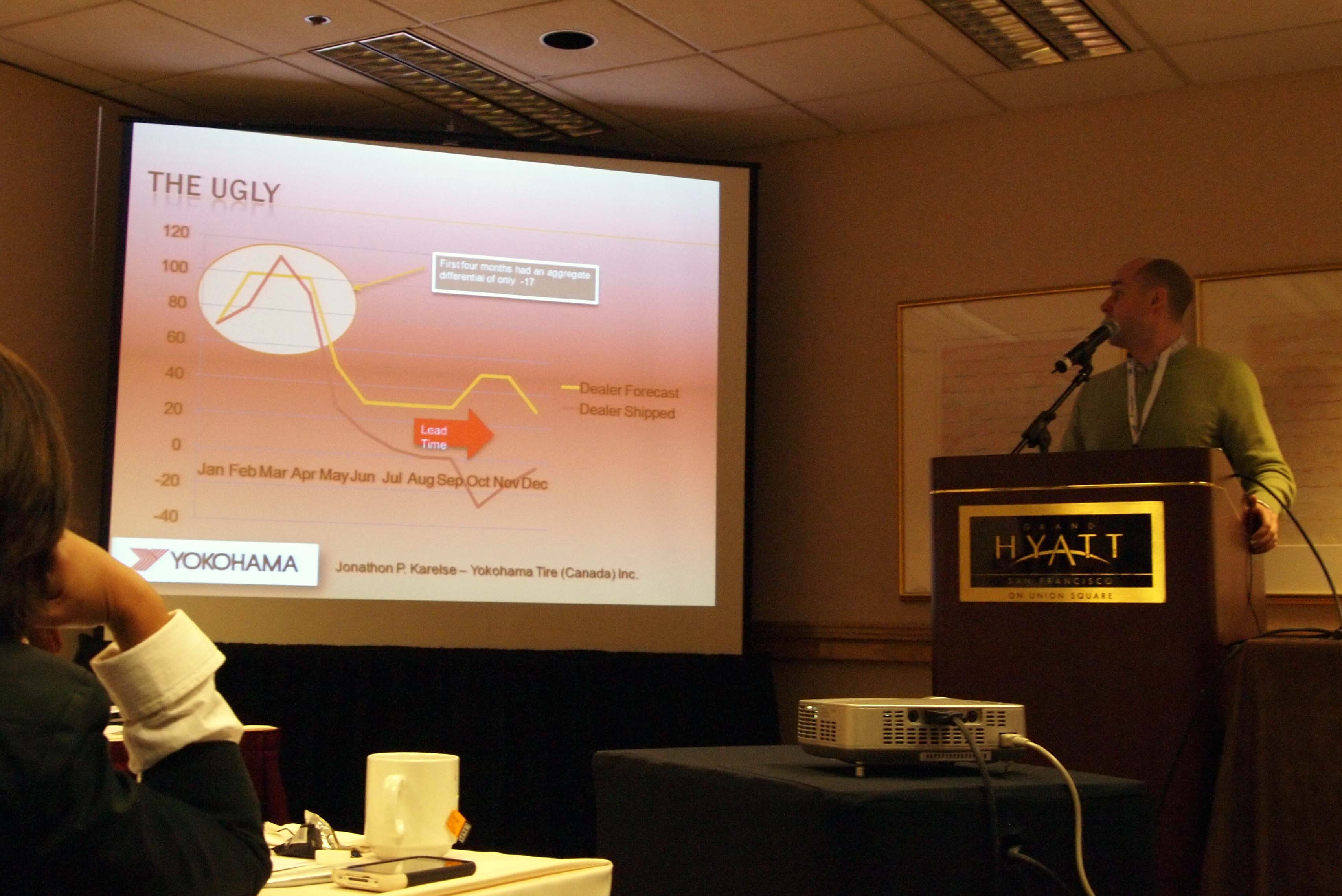 Panelist Jonathon Karelse from Yokohama Tire shared a worst practices experience and led the group through his folly of using a collaborative forecasting system for tire demand that did not work. While this was a method he learned at a previous IBF event, it happened to be ill-executed at Yokohama and led to excess inventory because of the bull-whip effect and beer games. One might ask “What do beer and whips have to do with forecasting tire demand?” Jonathon explained the bull-whip effect that as the velocity of the end of the whip gets so high that once it hits its target and ‘snaps’ what you are hearing is the end actually breaking the sound barrier. He used this analogy to explain what happened to the errors in supply chain. The Beer Games reference eluded to an MIT experiment which showed that a lack of trust within an organization can cause too much inventory. The Lessons learned were that removing the effect can be done by getting closer to each piece of the supply chain (and Jonathon still has a job so it must be true).