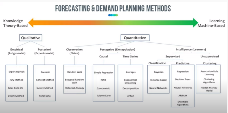 When it comes to forecasting methods, we have everything from pure qualitative methods to pure quantitative methods, and everything in between. On the far left of the image below you’ll see judgmental, opinion-based methods with knowledge as the inputs. On the far right, we have unsupervised machine learning – AI, Artificial Neural Networks etc. where the machine decides on the groupings and optimizes the parameters as they learn the test data. In between these two extremes we have naïve models, causal/relationship models, and time series models.
