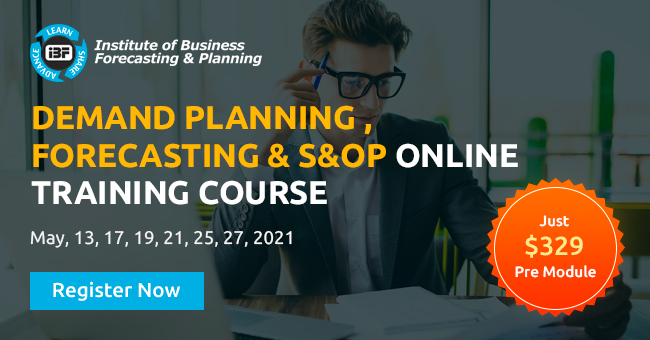 To develop your S&OP skills, there is no better training than IBF’s Forecasting, Demand Planning, & S&OP Live Online Training, held in May 2021. You’ll learn all aspects of the field from university professors and Directors of Supply Chain and Demand Planning at multinational companies. Pick and choose each module for $379 ($329 when you become an IBF member) or the full course plus exams to get IBF CPF certified. Find out more.