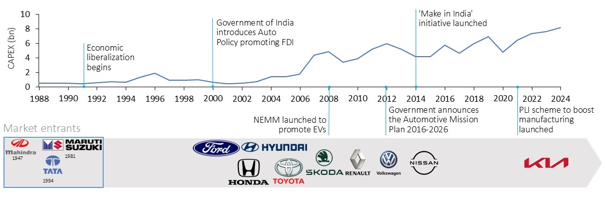 These logistics efforts support initiatives across sectors and the automotive industry, amongst others, has benefited from connections developed between key manufacturing hubs. Tata motors, Mahindra, Volkswagen and other international players have operated in India for the last two decades and doubled their overall CAPEX investment in R&D and Manufacturing from 2014–2024.