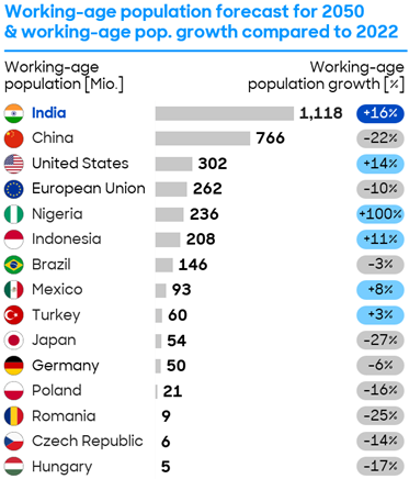 India’s working age population is anticipated to grow by 16% from 2022 to 2050, developing a large, highly educated workforce. In the same period workforces in China and other Eastern bloc countries popular for manufacturing will decline double digit percentages by 2050. Investment in manufacturing expansion where there is strong labor force growth reduces competitive pressure for skilled labor and ensures labor availability in the long run.