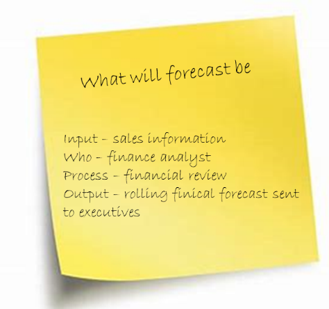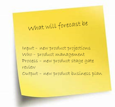 Before heading into groups, organizations should insist that each person first try to come up with their own thoughts and ideas of decision points. Start the process and have participants individually generate decisions that are made, write them down on post-it-notes and post them in the appropriate swim lanes or on a flipchart and then transfer ithem to swim lanes and the matrix. These can be any strategic decision over a 3 months horizon that impacts the business and planning process. It may be better to think of it as any recurring answer you have to give and word it as a question or decision point. What will the forecast be? It may be suitable with the right audience to not limit participants to their own sand boxes and allow them to brainstorm and add any decision they know is critical to whatever swim lane. When you have finished this step, you should have multiple decisions dotting your matrix with some duplicates and some you never considered.
