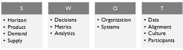 By applying the scores from the assessment, understanding the gaps to the benchmarks and knowing the culture and norms of the company, the S&OP Leader can categorize the 13 attributes into the SWOT. The Strengths and Weaknesses can be straightforward by placing the highest scoring attributes as Strengths and the lowest as Weaknesses. Opportunities and Threats will be more subjective. For example, the company recently implemented an Advanced Planning System (APS) for Demand and Capacity Planning. At the time of the assessment, the APS was not delivering its full potential, but as it rolls out and users become more proficient, the Systems score should improve. Therefore, it was categorized not as a Weakness, but as an Opportunity because of the natural upside to the Company and the S&OP process.