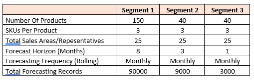 Segmentation plays a crucial role in prioritizing data. Let’s say our company has 150 products but we cannot forecast effectively for all of them. To better use our time and resources, we can segment by product, customer, geography and other criteria. Table 1 shows product segmentation based on profitability. We start off with 150 products and 9000 forecasting records. Segment 2 cuts this down to 40 products. Segment 3 then cuts the forecasting horizon from 8 months to 3 months to reduce the number of forecasting records we have to analyze.