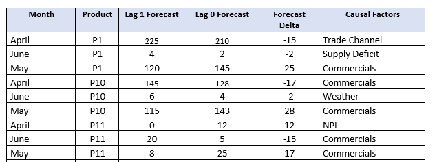 Table 2 contains the Forecast Delta (i.e. the variation between Lag 1 forecast vs Lag 0 forecast) and the major causal factor influencing the forecast delta. Try to keep the list of these factors limited to 6 to 8 based on product, market or customer attributes. They can be further bifurcated as internal or external factors.
