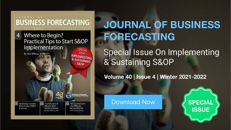 This is an extract from the 2021/2022 Special Issue of The Journal of Business Forecasting on implementing and sustaining S&OP. Download an extended preview here or become an IBF member and get both full digital access and the print version delivered to your door every quarter, plus a a host of other member benefits including discounted conferences and training, exclusive workshops, and access to the entire IBF knowledge library.