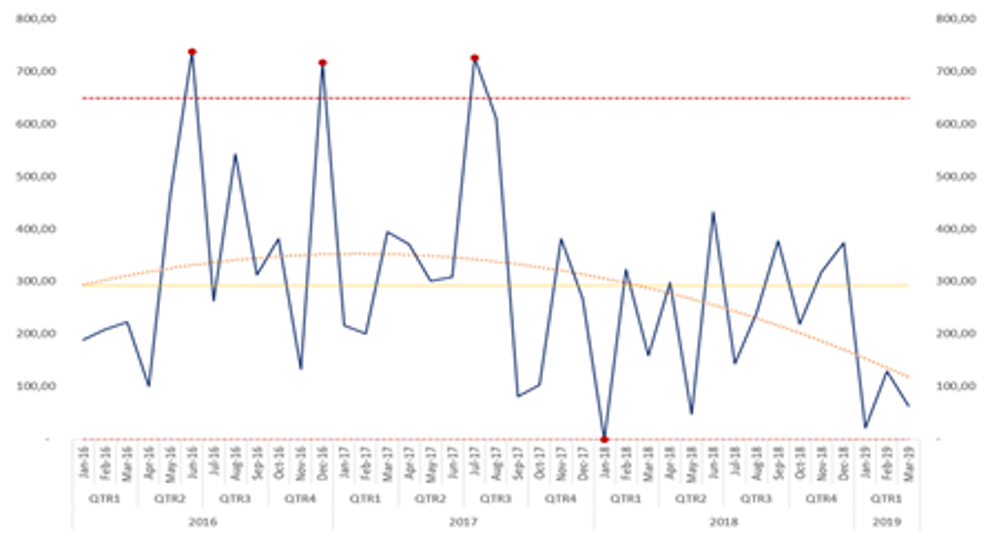 Analyze the data in graphs as shown in the figure above. To facilitate the identification of outliers graphically, it helps to plot the data on a dashboard so the data can be seen in different hierarchies and granularity e.g. region, product family, managers, channels, and SKU. Doing this is useful because, many times, when we look at the total number, we may not be able to identify the outlier. This is because if it has low volume, it will be lost in the rest of the data. But when we go down a level in the hierarchy, we can begin to identify them.