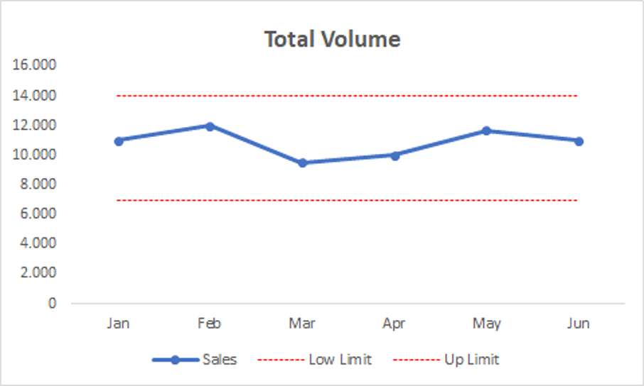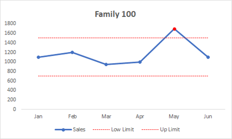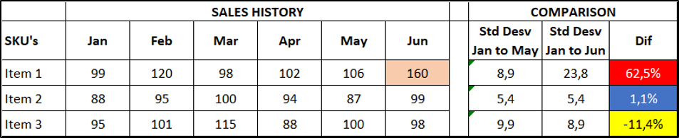 Another way to identify outliers is through tables, using a percentage as a comparison. This analysis needs to be done monthly. In the following example, we have normal behavior for item 1 from January to May. In June, however, when we updated the standard deviation, we identified a data point 62.5% above normal, which is definitely an anomaly and needs to be understood and addressed.
